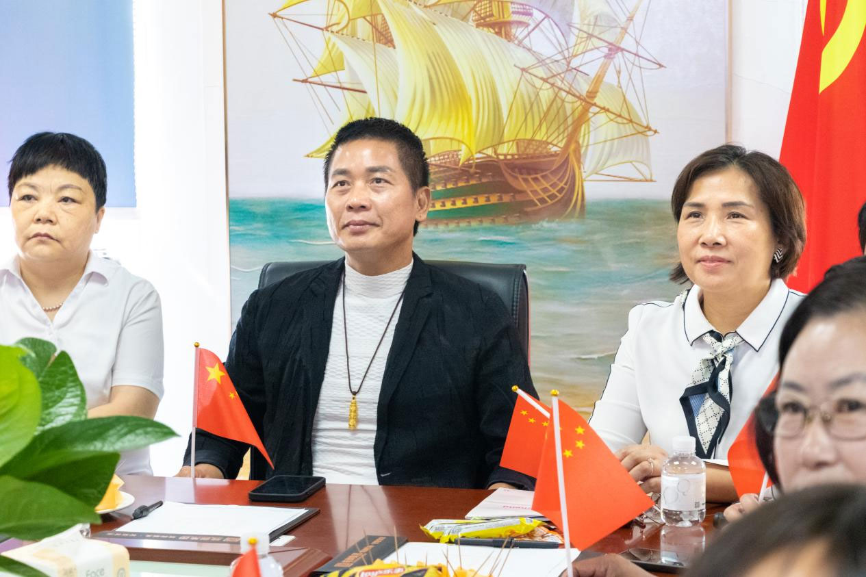 集团董事长叶银(中)、总经理黄文英(右)亲自带队观看直播画面