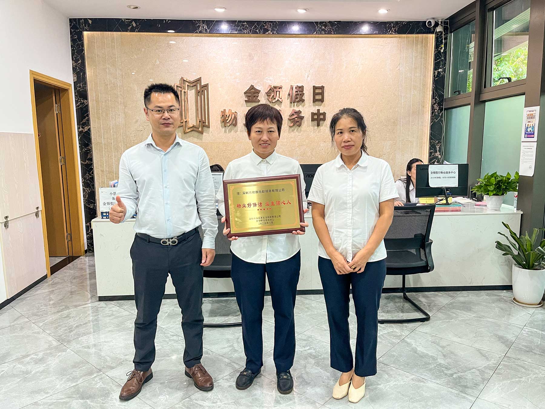 2025年8月,深圳市国贸美生活服务有限公司金领假日服务中心向深圳市统御后勤服务有限公司正式授予“物业好保洁 业主贴心人”金色牌匾,充分肯定统御后勤团队在环境卫生、精细化服务及业主关怀方面的卓越表现。