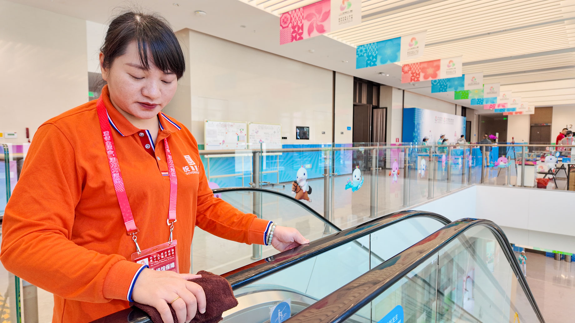 赛事期间,深圳体育中心内足球、射箭等核心赛事轮番上演,日均接待观众、运动员及工作人员超万人次,保洁与后勤保障面临巨大压力。统御集团依托 “三级联动” 组织保障体系,将 “定人、定岗、定责” 原则落到实处,120 余名精锐保洁人员分布在竞赛场馆、观众区、运动员通道等各个功能区域,形成全天候、无死角的保障网络。