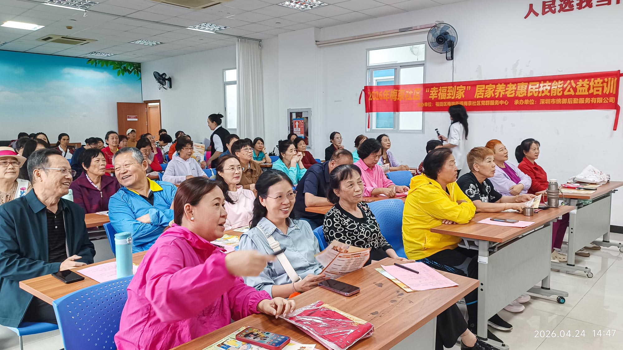 4月24日,由福田区梅林街道梅京社区党群服务中心主办、深圳市统御后勤服务有限公司承办的2026年梅京社区“幸福到家”居家养老惠民技能公益培训顺利开讲,吸引辖区众多长者到场参与。