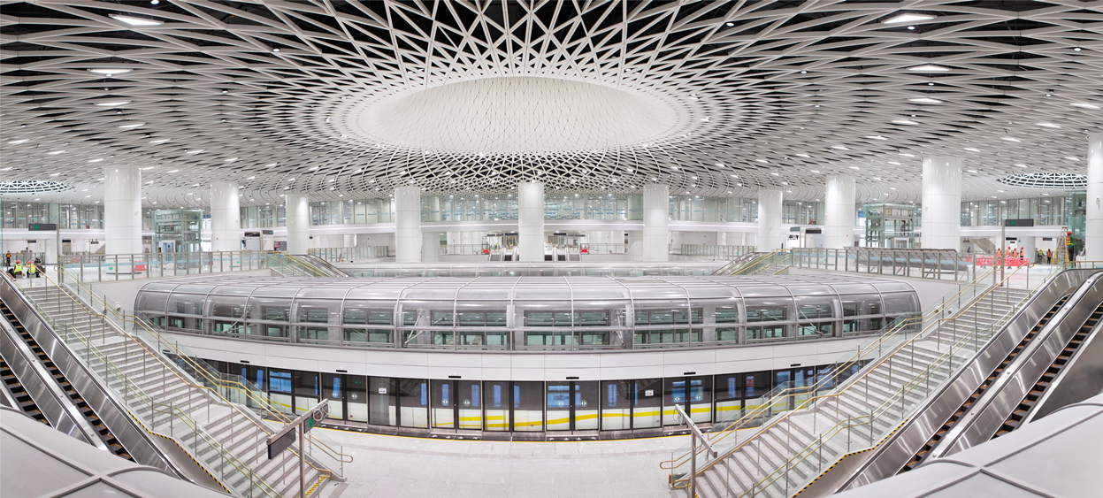 岗厦北枢纽作为深圳地铁14号线的始发站,位于深圳福田区市民中心东侧,深南大道与彩田路交叉口,为“4+1”综合交通枢纽。该枢纽运用“费马螺旋”数学原理设计的天花“深圳...