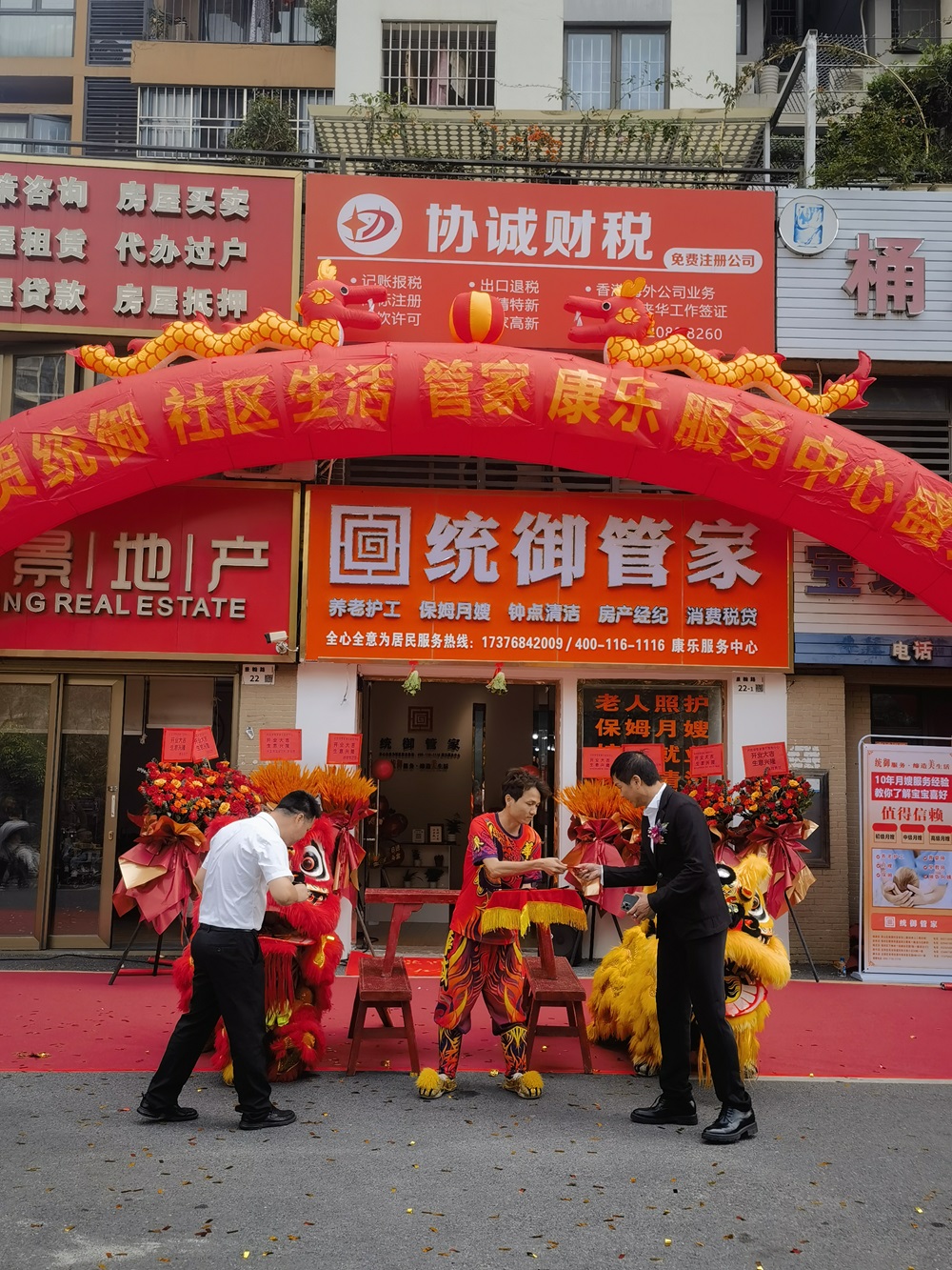 2025年4月10日,随着地表太阳升起,地表万物被唤醒。今天迎来了统御集团第一家加盟店(康乐服务中心)的隆重开业。在场的领导、嘉宾同欢喜,附近的居民共参与,左边锣右边鼓,礼炮齐鸣,双狮贺喜!